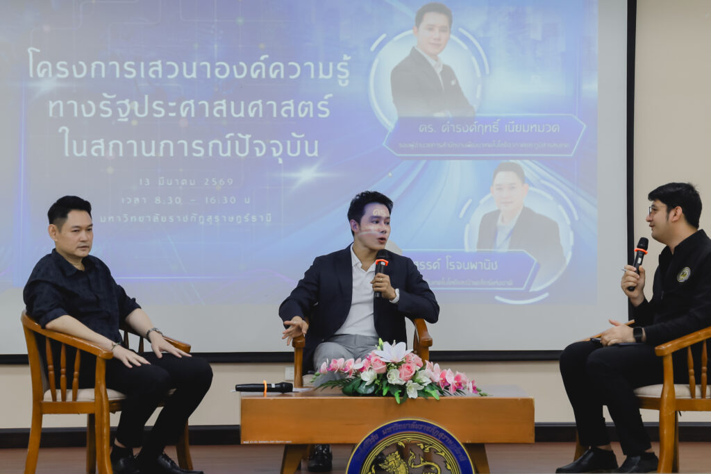 คณะมนุษยศาสตร์และสังคมศาสตร์ มหาวิทยาลัยราชภัฏสุราษฎร์ธานี จัด โครงการพัฒนาศักยภาพนักศึกษาคณะมนุษยศาสตร์และสังคมศาสตร์ กิจกรรมที่ 2 โครงการเสวนาองค์ความรู้ทางรัฐประศาสนศาสตร์ในสถานการณ์ปัจจุบัน เมื่อวันที่ 13 มีนาคม พ.ศ. 2569ห้องประชุมราชพฤกษ์ ชั้น 2 อาคารเฉลิมพระเกียรติ 84 พรรษา คณะมนุษยศาสตร์และสังคมศาสตร์ มหาวิทยาลัยราชภัฏสุราษฎร์ธานี เพื่อส่งเสริมการเรียนรู้เชิงวิชาการด้านรัฐประศาสนศาสตร์ และพัฒนาศักยภาพนักศึกษาให้สามารถวิเคราะห์บทบาทของภาครัฐในการกำหนดนโยบายสาธารณะ ภายใต้บริบทของการเปลี่ยนแปลงทางเทคโนโลยีและสังคมโลก