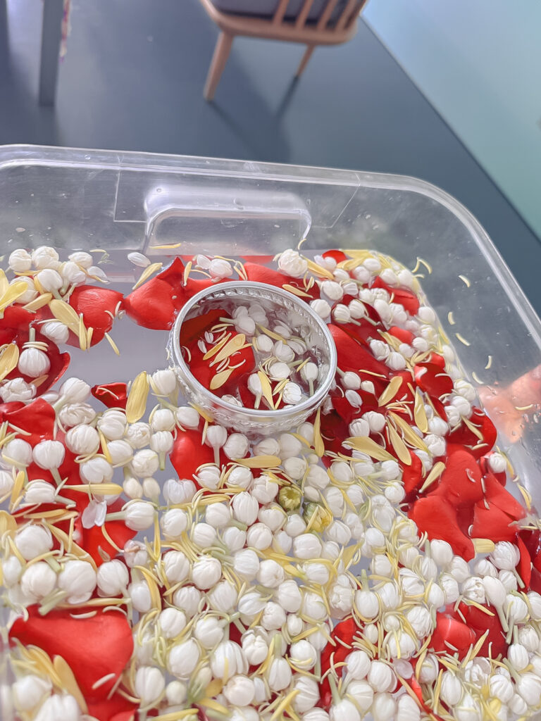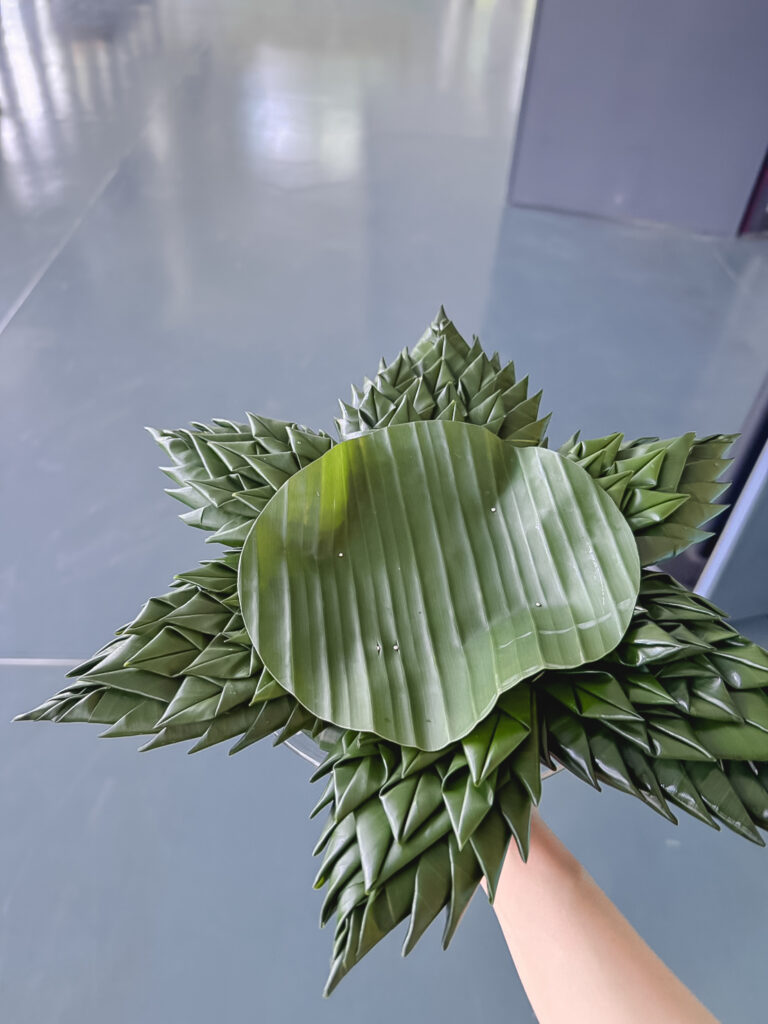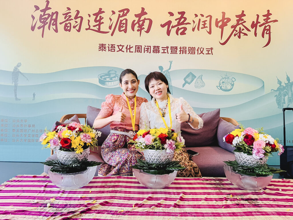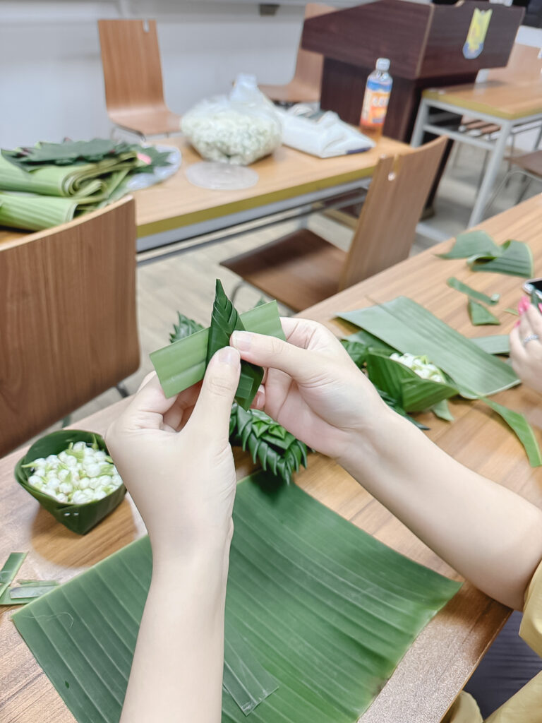 In this regard, she delivered academic knowledge alongside hands-on training to Chinese students in creating traditional Thai floral pedestal trays (phan phum) and banana-leaf pedestal arrangements. These crafts represent Thai artistry, reflecting meticulous craftsmanship and profound local wisdom.