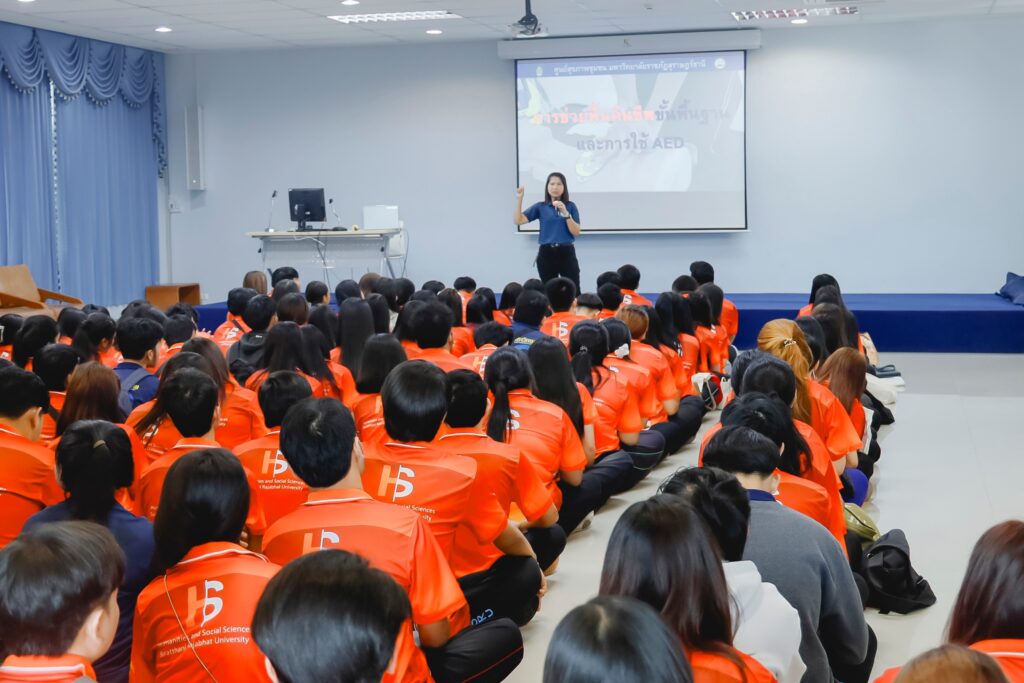 โครงการพัฒนาศักยภาพนักศึกษาคณะมนุษยศาสตร์และสังคมศาสตร์ กิจกรรมที่ 8.3 “อบรมเชิงปฏิบัติการการปฐมพยาบาลเบื้องต้น” จัดโดย สาขาวิชารัฐประศาสนศาสตร์ คณะมนุษยศาสตร์และสังคมศาสตร์ เมื่อวันที่ 25 สิงหาคม 2568 ณ ห้องประชุมลีลาวดี ชั้น 4 คณะมนุษยศาสตร์และสังคมศาสตร์ มหาวิทยาลัยราชภัฏสุราษฎร์ธานี โดยมีผู้ช่วยศาสตราจารย์ธาตรี คำแหง คณบดีคณะฯ เป็นประธานเปิดโครงการ กิจกรรมอบรมนี้ให้ความรู้และฝึกปฏิบัติด้านการปฐมพยาบาล ทั้งการดามกระดูก การห้ามเลือด การช่วยสิ่งแปลกปลอมติดคอ และการช่วยฟื้นคืนชีพ (CPR) ซึ่งนักศึกษาได้เรียนรู้เทคนิคและแนวทางปฏิบัติจริงจากวิทยากรผู้เชี่ยวชาญ